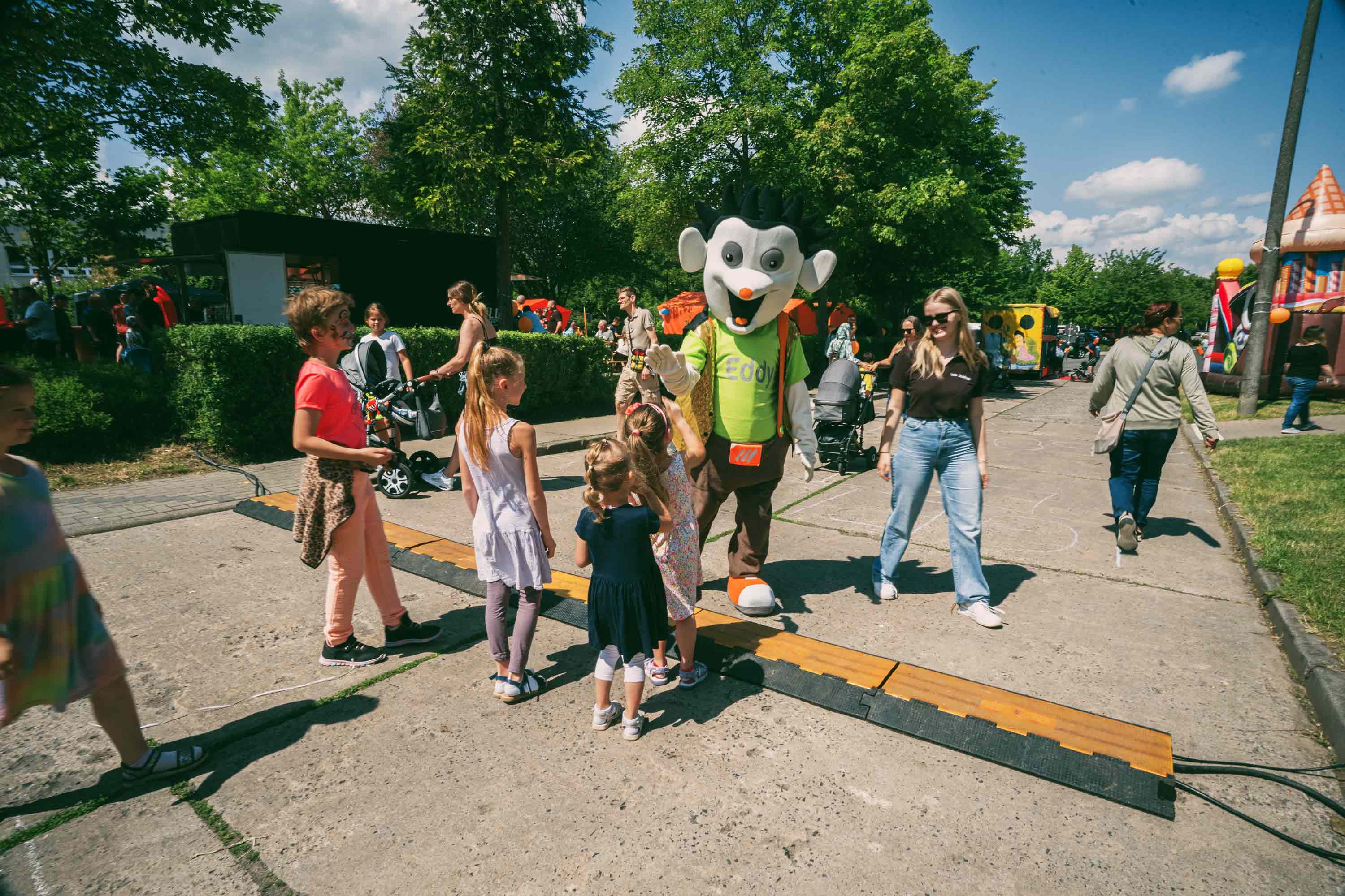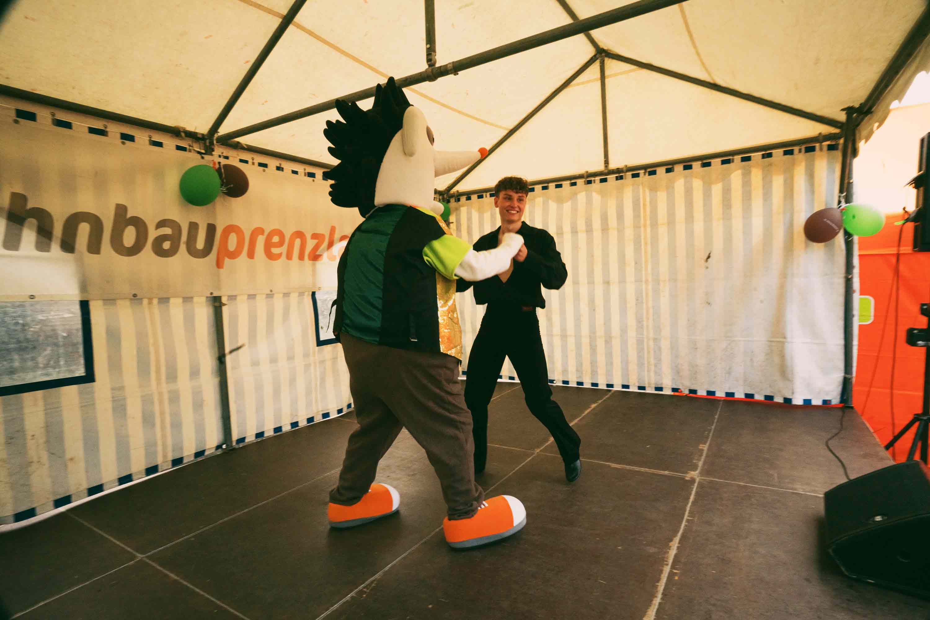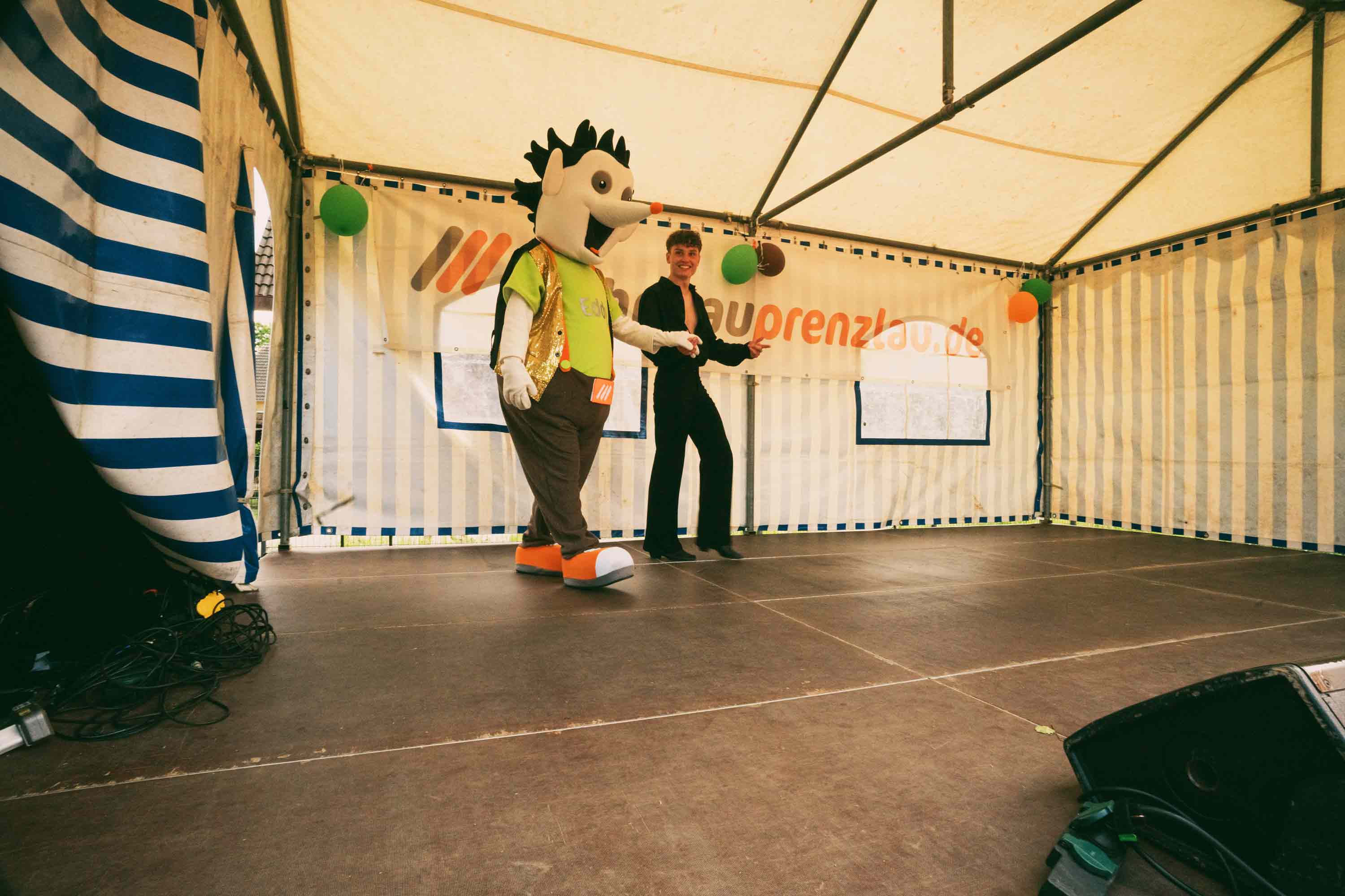 Um 13.20 Uhr war es dann plötzlich ruhig auf der Bühne. Auf der Straße zwischen den Ständen und der Festwiese war rotes Flatterband gespannt. Musik an, Flashmob ab! Die Zumba Kids und Showtänzer der IG Frauen sowie der Carneval Club überraschten gemeinsam das Publikum mit einer ganz besonderen Show-Einlage. Auch Maskottchen Eddy der Igel ließ es sich nicht nehmen, ein paar Tanzschritte einzustudieren, die er unter tosendem Applaus auf der Bühne mit Niklas Mahler als krönenden Abschluss präsentierte. Niklas Mahler ist dualer Student im Bereich Facility Management bei der Wohnbau Prenzlau. In seiner Freizeit jedoch interessiert er sich für ein ganz anderes Gebiet, nämlich für das Tanzen. Mit fünf Jahren begann er das Tanzbein zu schwingen, seit etwa neun Jahren gemeinsam mit seiner Tanzpartnerin Leonie Beese. Zusammen sind sie Landesmeister im Paartanz in Mecklenburg-Vorpommern und begeisterten auf der Bühne des Igelfestes.